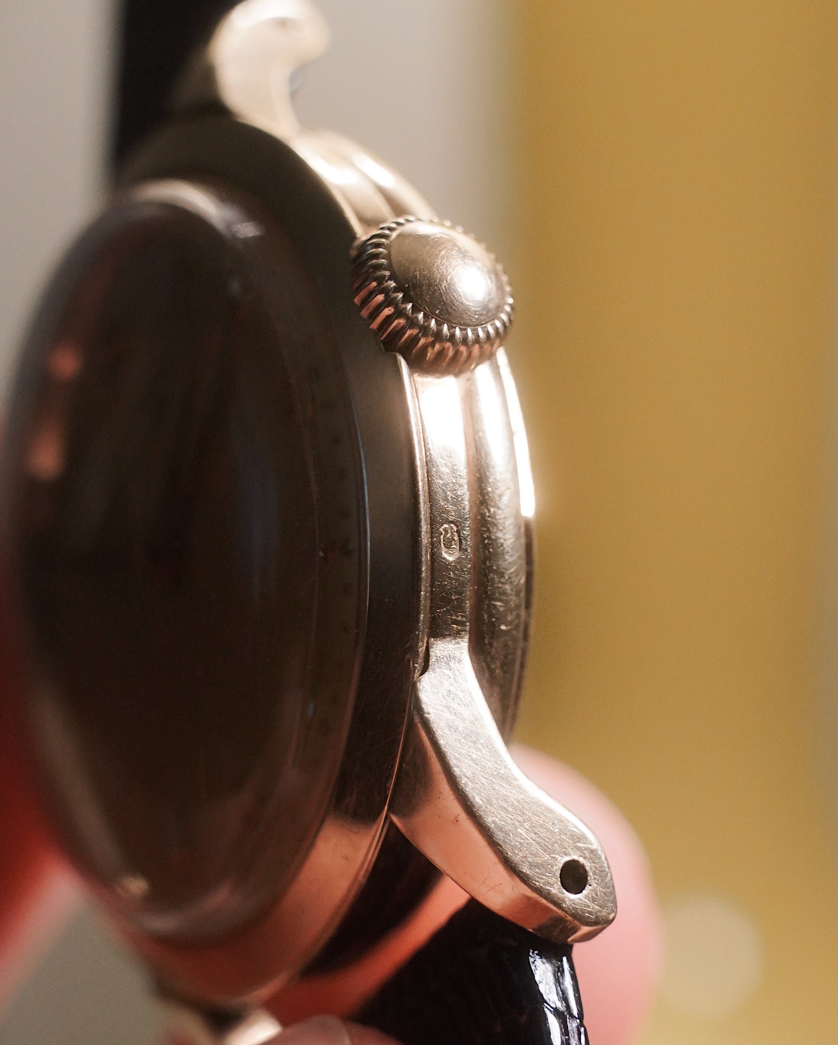 The Stern Frères dial is exceptionally well-preserved, with a rich golden patina from years of sunlight exposure that gives the watch incredible warmth and character. Its design, with applied Arabic numerals, faceted indices, and a pearled minute track, is nearly identical to contemporary Patek Philippe dials of the period.